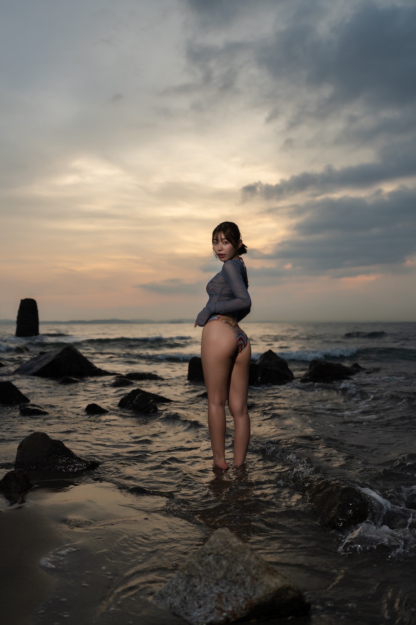 ウエスト55cmのくびれからヒップへと続く、建築的とも言えるS字ラインは、学生時代のスポーツ経験や、K-1 GIRLSとしての活動に向けたトレーニングによって培われた、しなやかな筋肉に裏打ちされた身体の芸術的な曲線美。