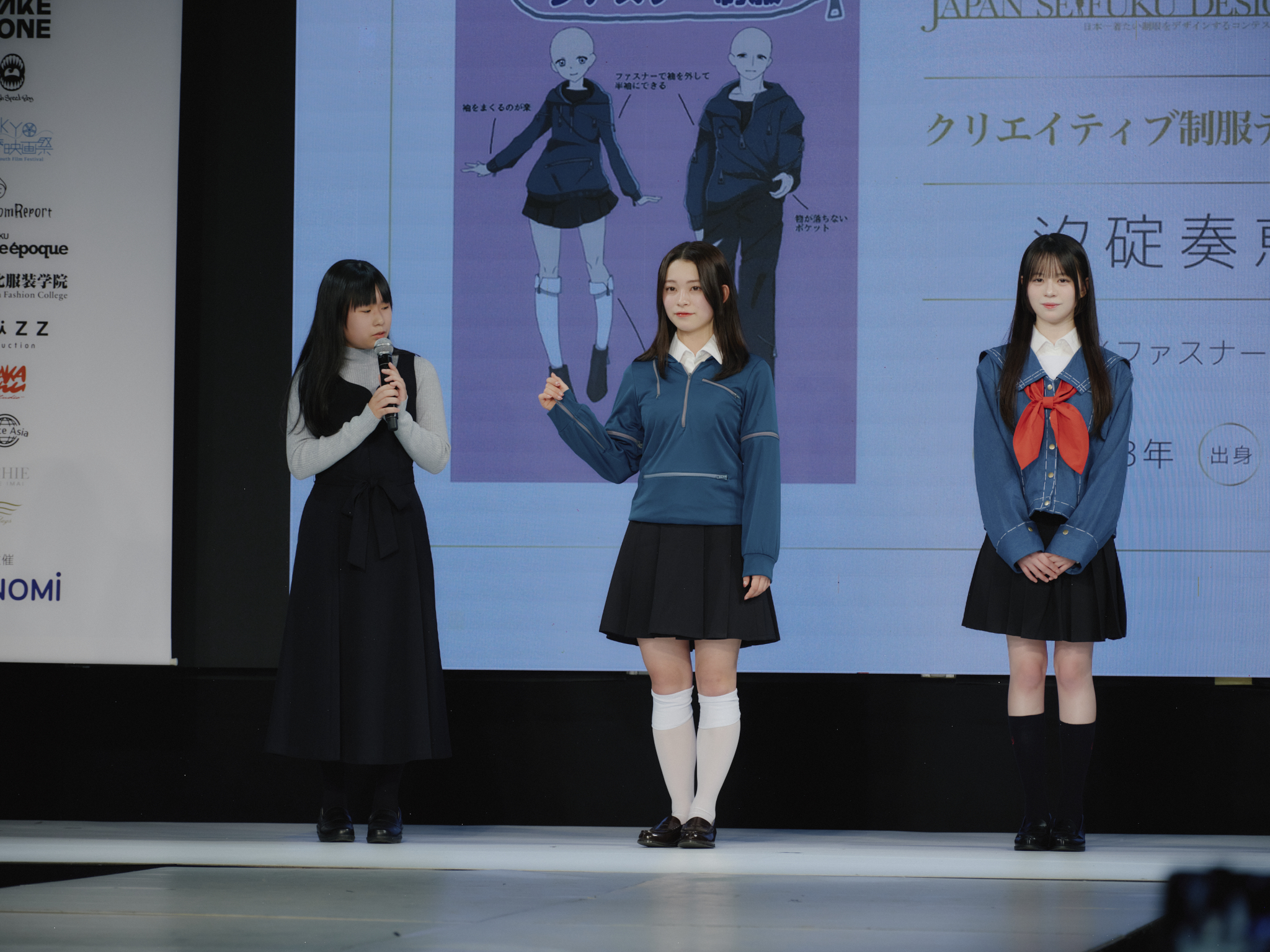 制服デザインアワードでは受賞作品を実際に制作し制服アワードグランプリの紗和、準グランプリの水野樺恋が着用しランウェイ。斬新なスタイルが目を引くと、制服音楽アワードでは、なるみが自作曲を披露するステージも。