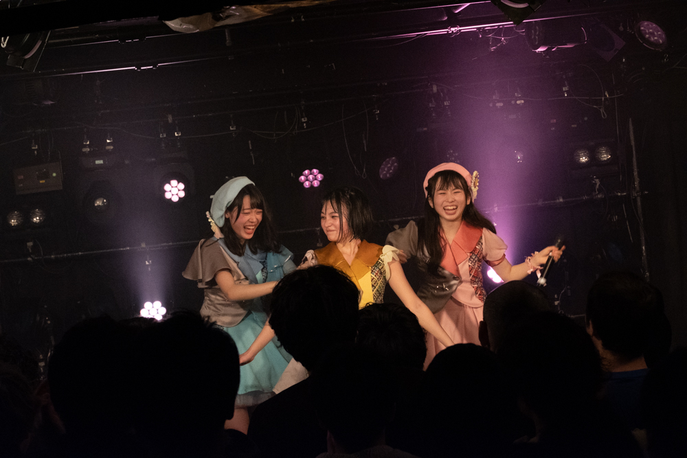 はじまりの曲である『ラビンNν』から『アナタボシ』、『こいしょ!!!』のカバー曲を続けると、さらにスピード感・ドタバタ感満載の『クレイジーアラーム』と4曲を披露。自己紹介に観客も声援を贈り、ステージの幕開けに3人は満面の笑顔を見せます。すると、ここからはソロコーナーへと突入。