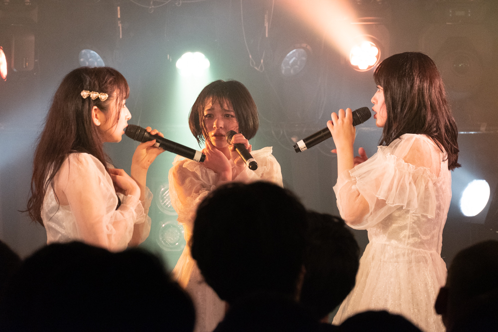 “2020年のおしゃかわ”をコンセプトにジャジーかつポップな良曲と、キュートなルックスがじわじわと人気を集めている3人の初ワンマンライブということで会場はソールドアウト。観客が期待に胸を膨らませる中、ライトが落ちるとスィングするOvertureが流れメンバーが登場しました。